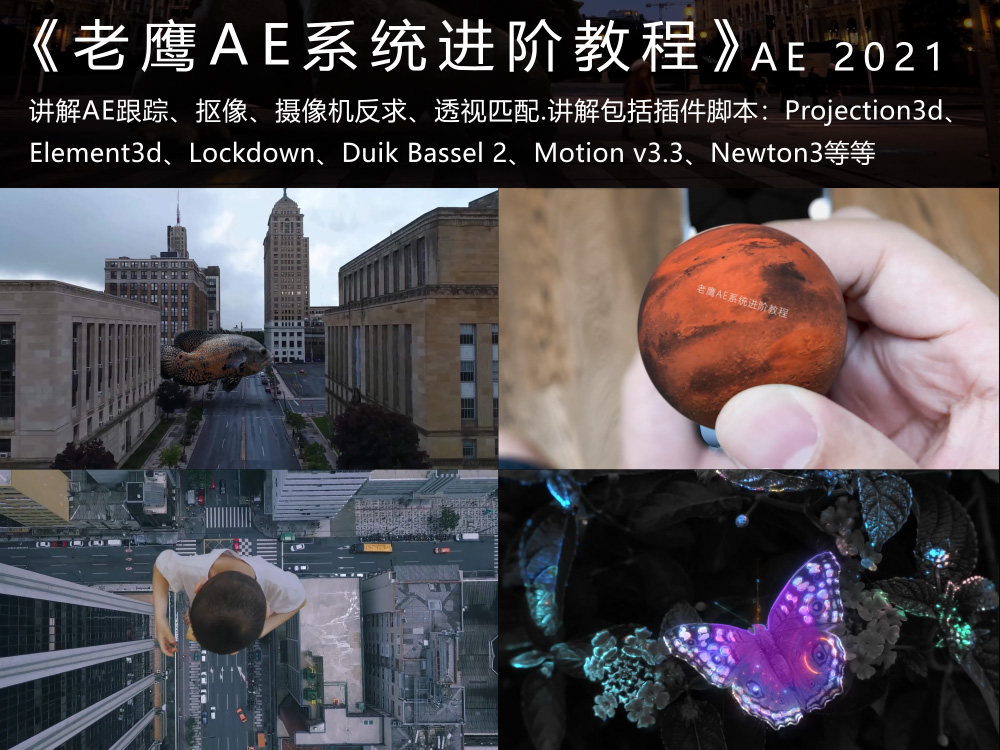 讲解AE跟踪、抠像、复杂摄像机反求、透视匹配。讲解插件脚本:Projection3d、Element3d、Lockdown、Duik Bassel 2、Motionv3.3、Newton3、Pastiche、Autofill、Joysticks_n_Sliders、Red Giant VFX Suite插件包: Chromatic Displacement、King Pin Tracker、Optical Glow Primatte Keyer 6、Reflection、Shad