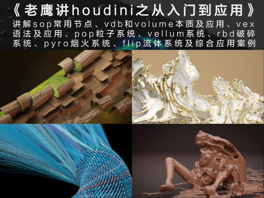 老鹰用通俗易懂的语言从0开始讲解houdini,弄懂逻辑、理解原理,houdini真的没那么难。讲解sop常用节点,讲解vdb和volume的本质及应用,讲解vex原理及应用技巧,讲解dop模块,比如pop粒子系统、vellum系统、flip系统、pyro系统、破碎系统rbd。关于材质渲染,讲解houdini的默认渲染器mantra,karma渲染器,渲染插件redshift和octane,也会讲解houdini和c4d的完美结合流程。每周四晚上直播答疑,课程共227节课,72小时内容.